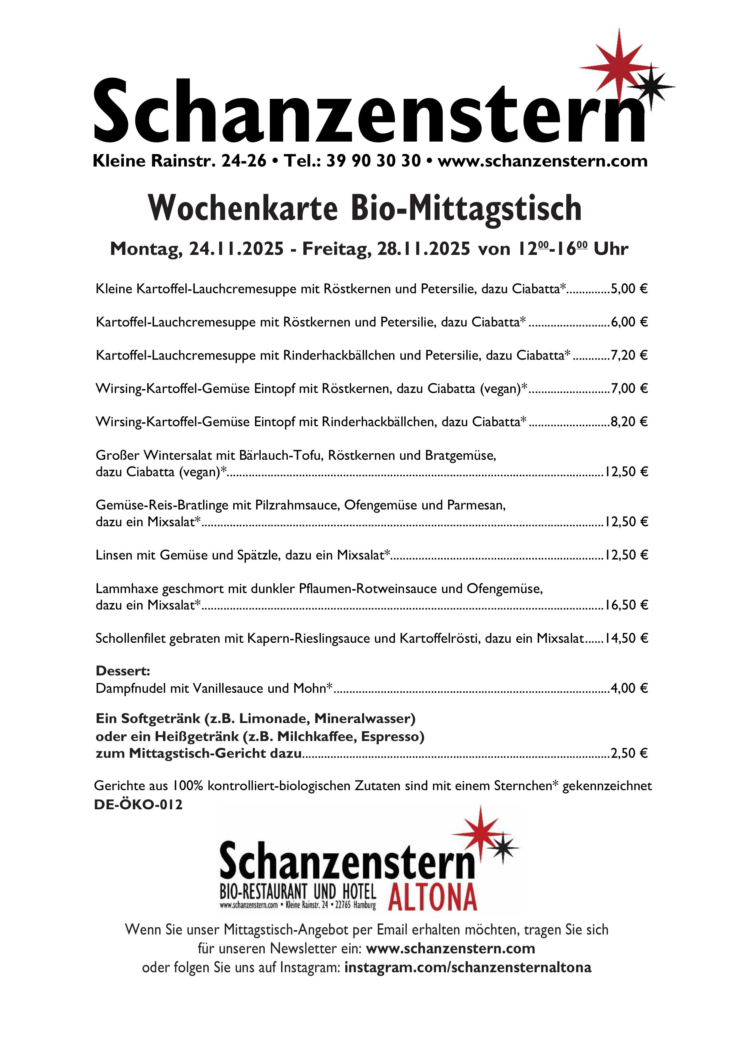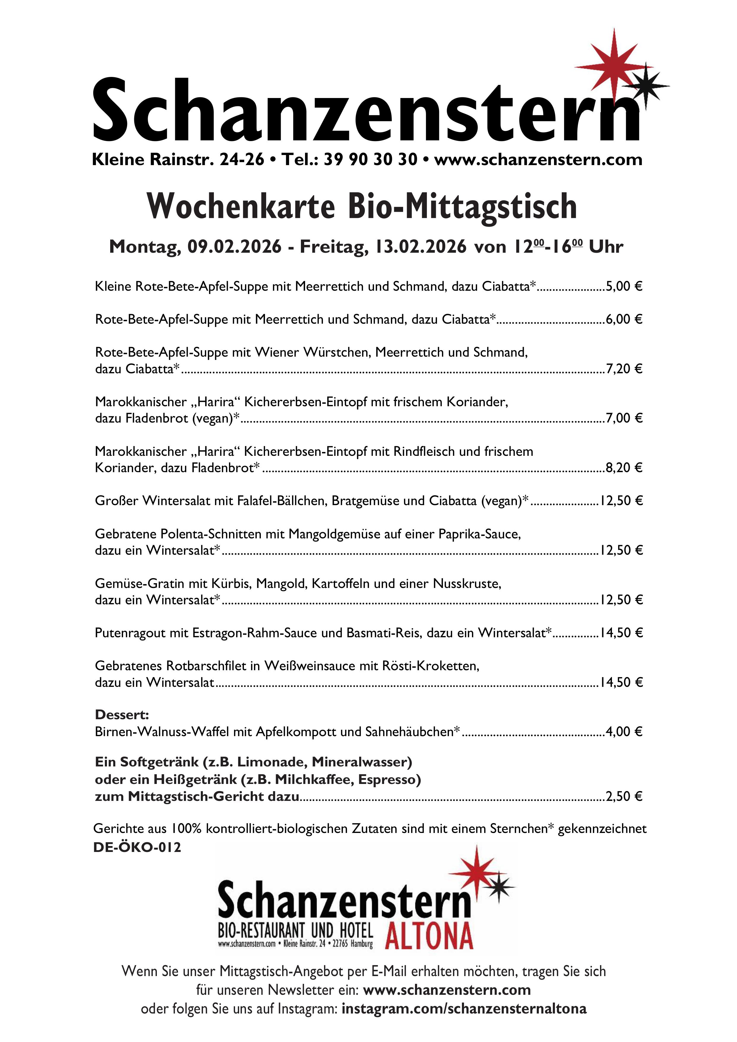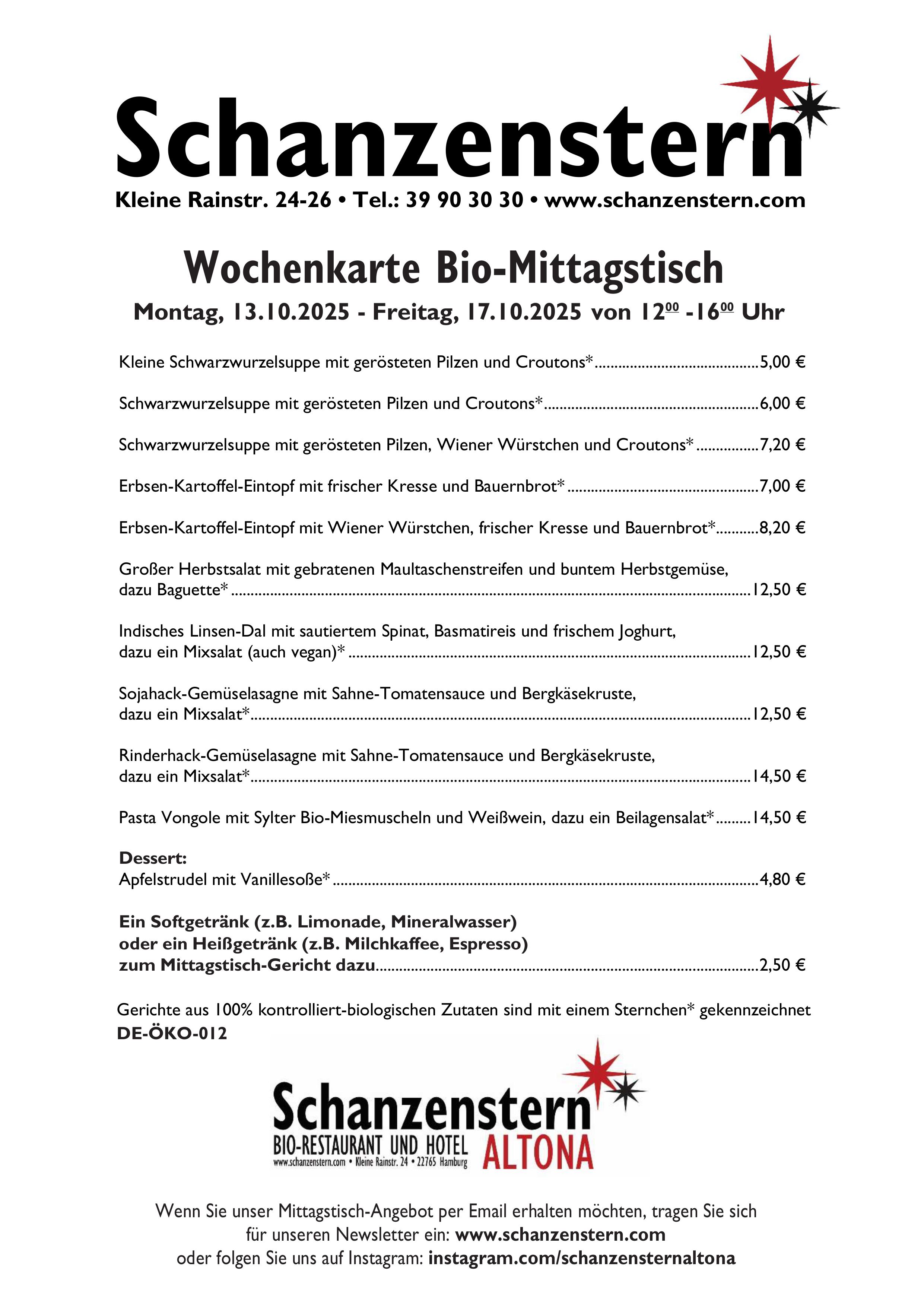 Our current lunch menu for the forthcoming week is posted every Saturday Bio-Mittagstisch Wochenangebot - or you can follow us on Twitter.