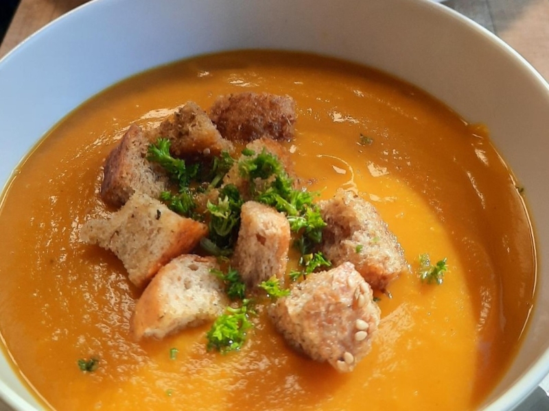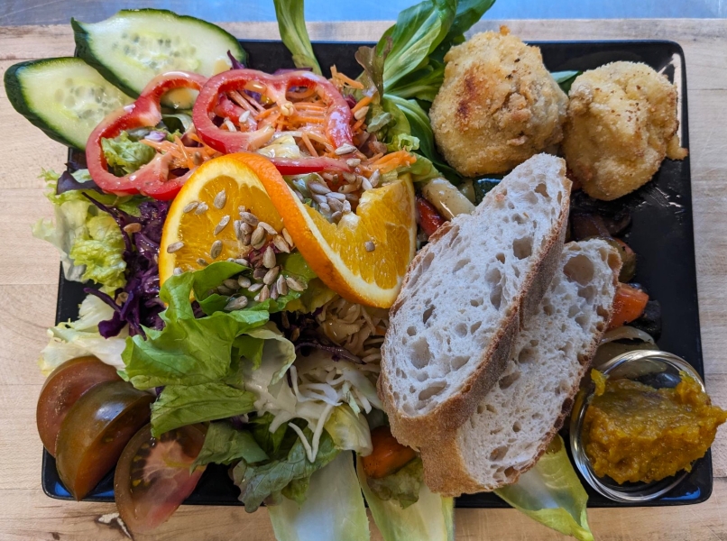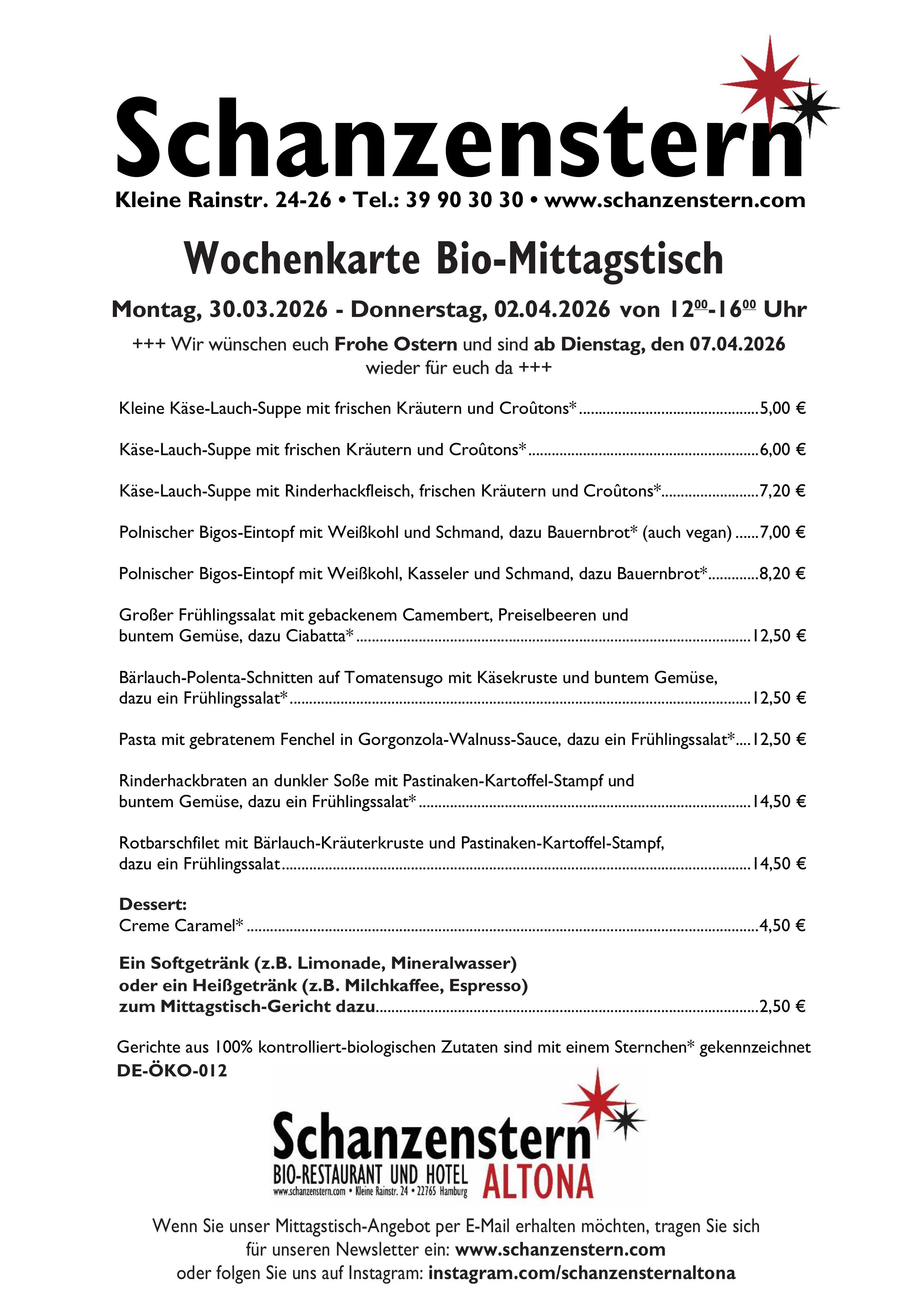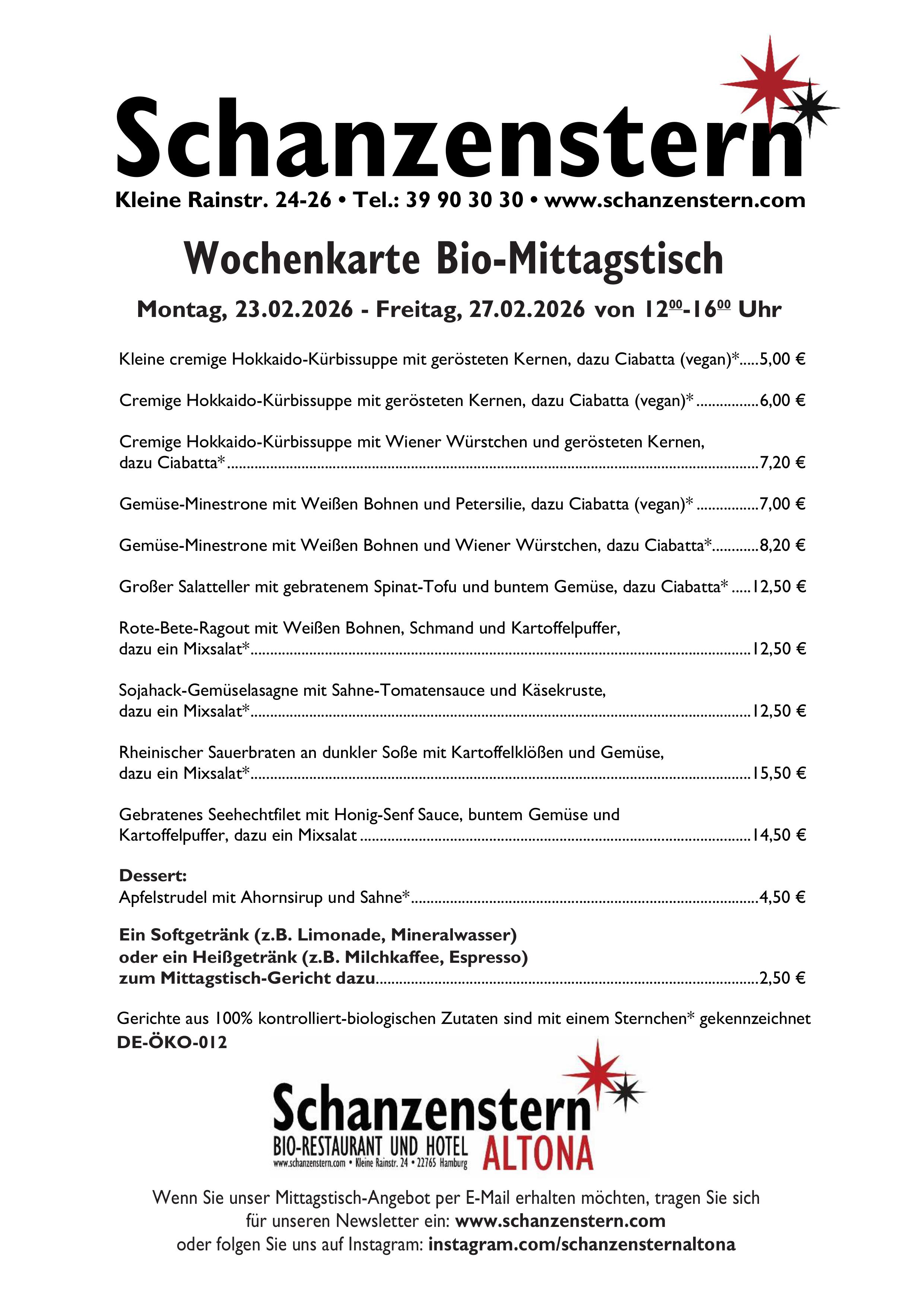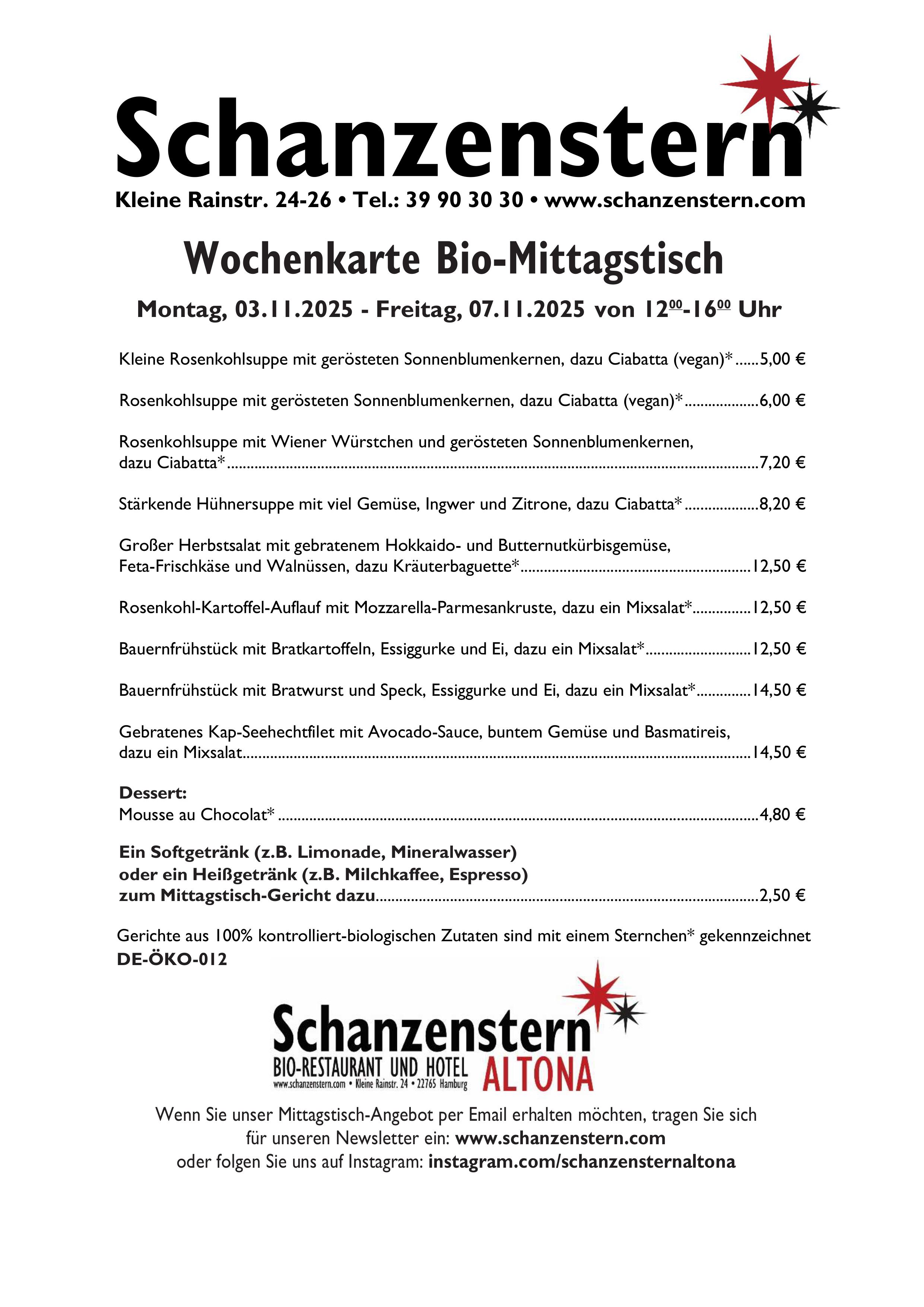 Unser täglich wechselndes Mittagstisch-Angebot wird, bis auf wenige Ausnahmen, komplett aus biologischen Zutaten zubereitet. Zu unserem Mittagstisch wird immer auch eine Salatbeilage serviert.